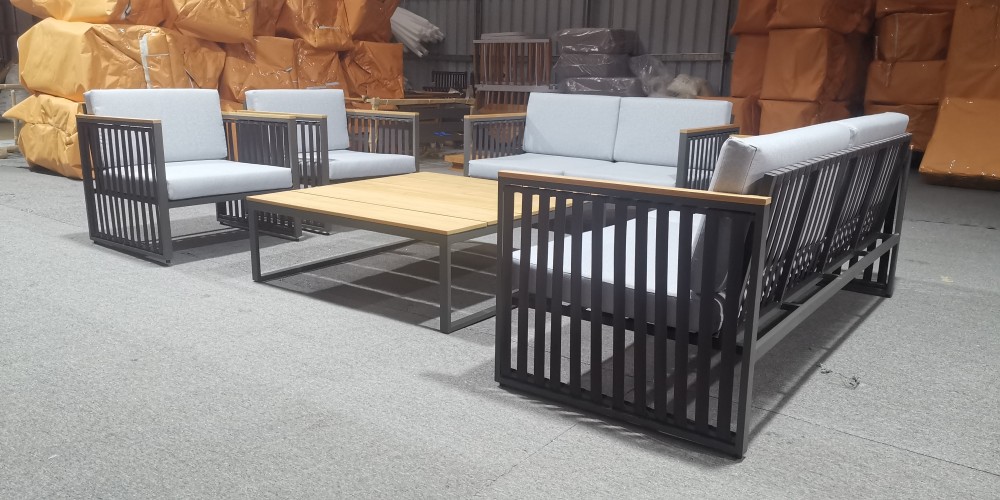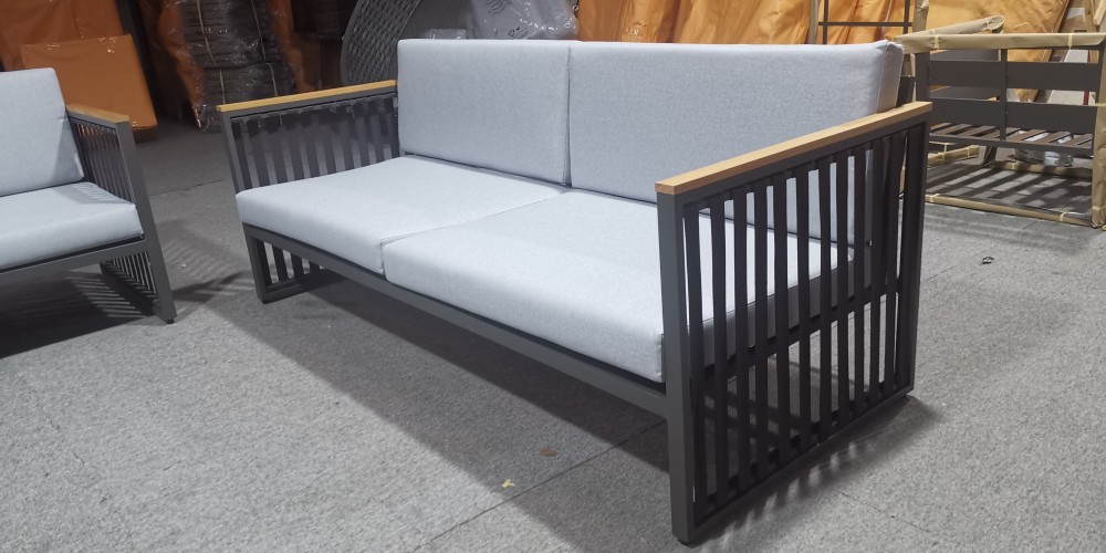 Tvirto aliuminio rėmo konstrukciją papildo šilti ir ilgaamžiai tikmedžio medienos elementai, kurie suteikia baldui natūralų, prabangų akcentą. Išskirtinis vizualinis sprendimas – rankų darbo virvės pynimas (rope weaving) – ne tik stilingas, bet ir patvarus pasirinkimas lauko sąlygoms.