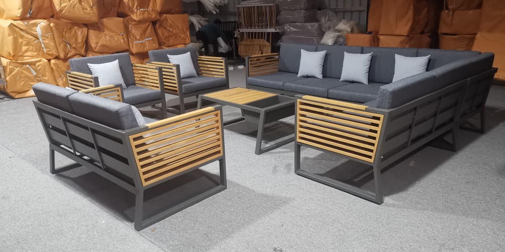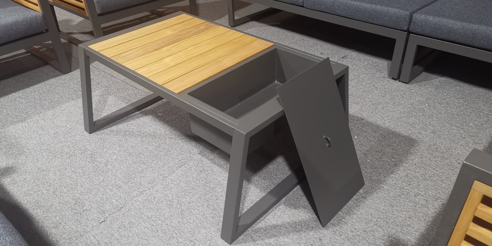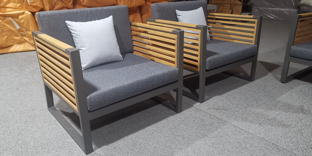 Šie baldai sukurti tiems, kurie vertina kokybę ir estetiką. Tvirtas aliuminio rėmas padengtas aukščiausios kokybės dažais, o šaltą metalą subtiliai sušvelnina natūralios tikmedžio medienos akcentai – elegancija, kuri niekada neišeina iš mados.